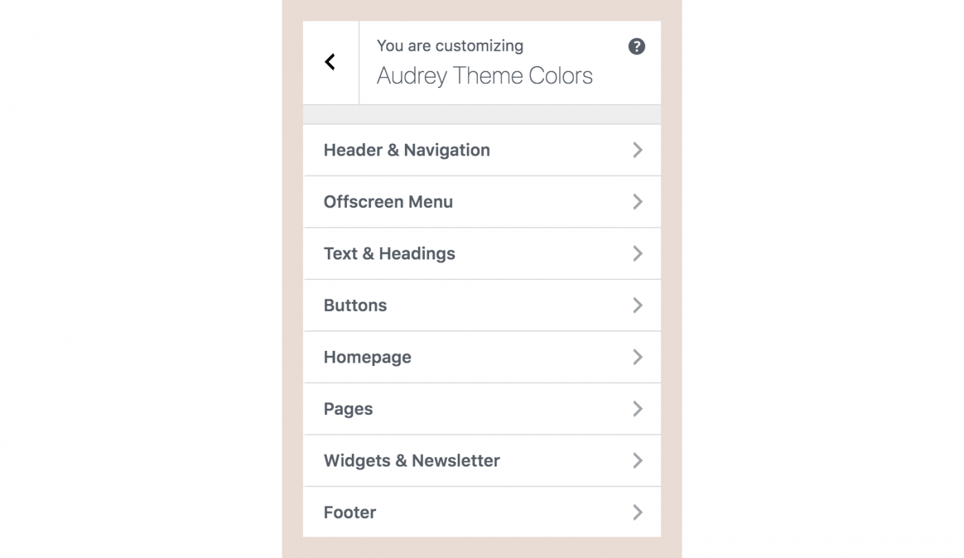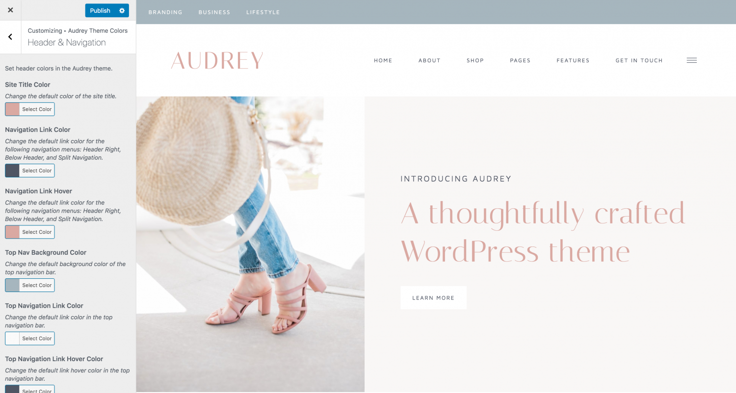 With the Audrey theme, you can customize your site in real-time using the WordPress Customizer Panel. This allows you to fine tune and tweak how your site looks before going live! Audrey features our signature color customization panel with over 70 color controls, all organized into categories so you can easily find the setting you are looking for.